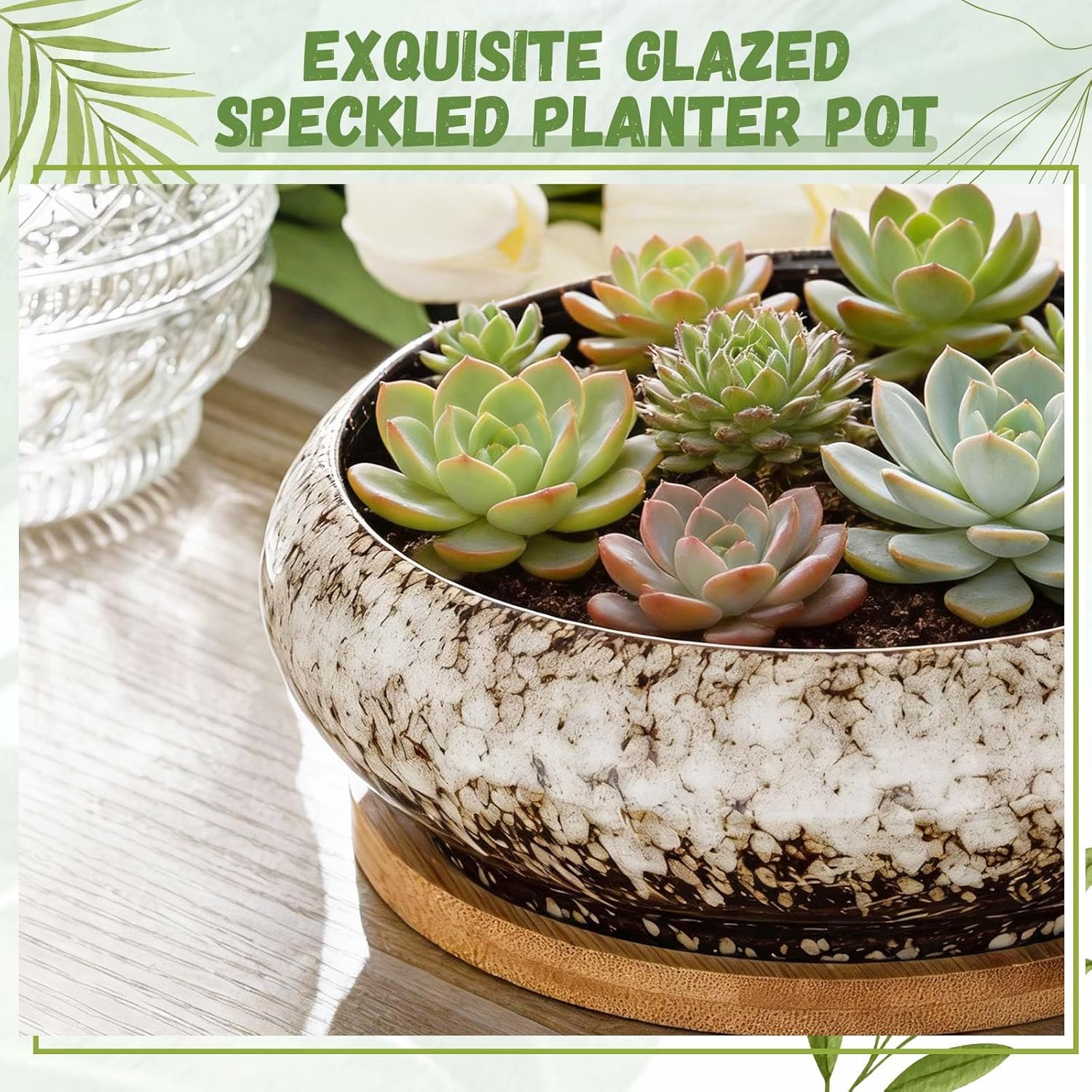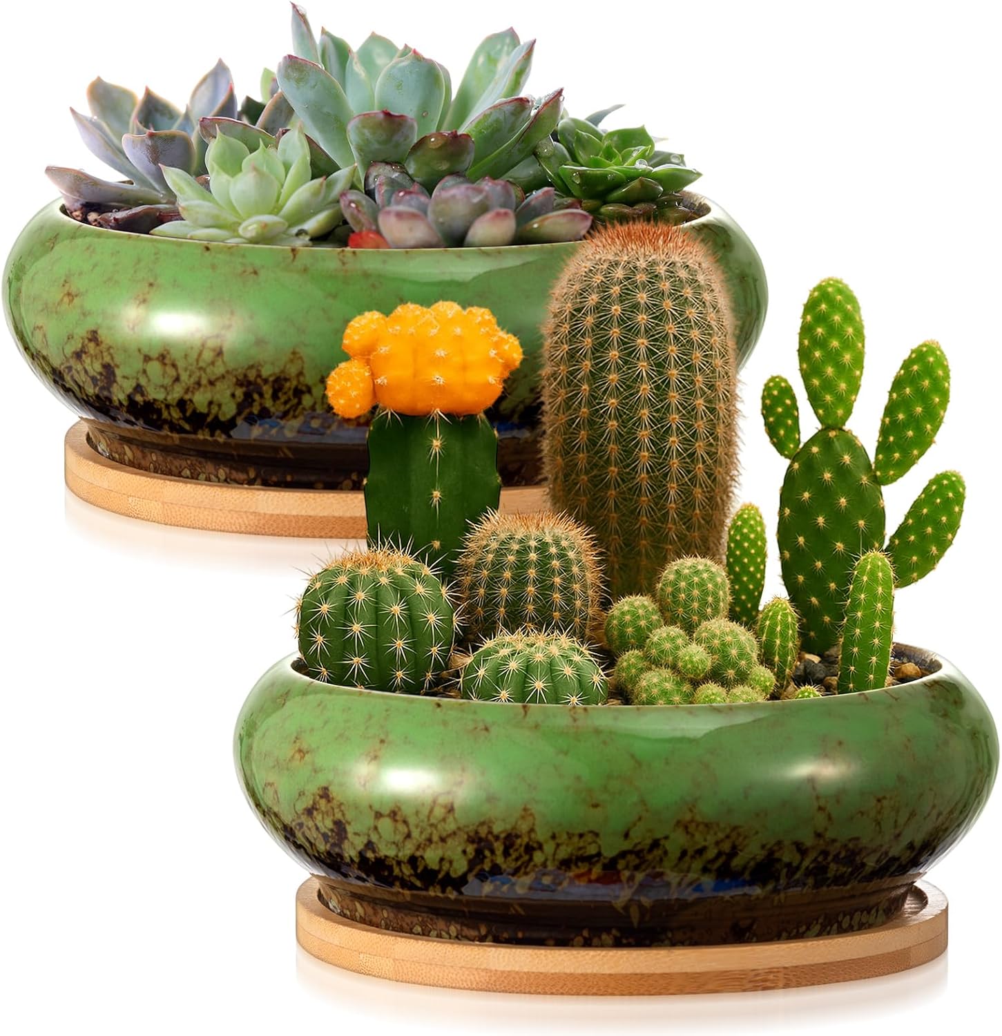 Features: Made of smooth ceramic, these succulent plant pots have a look that blends with various decor styles. The bamboo trays add texture. The plant pot works well in spaces like apartments, offices while still accommodating small plants. Specifications: Material: ceramics, bamboo Color: Multicolor Size: Large shallow pot about 7.3 inches/ 18.5 cm Small shallow pot about 4 inches/ 10.2 cm Package includes: 5 x Shallow planters 5 x Trays Notes: Manual measurement, please allow slight errors on size. The color may exist a slight difference due to different screen displays