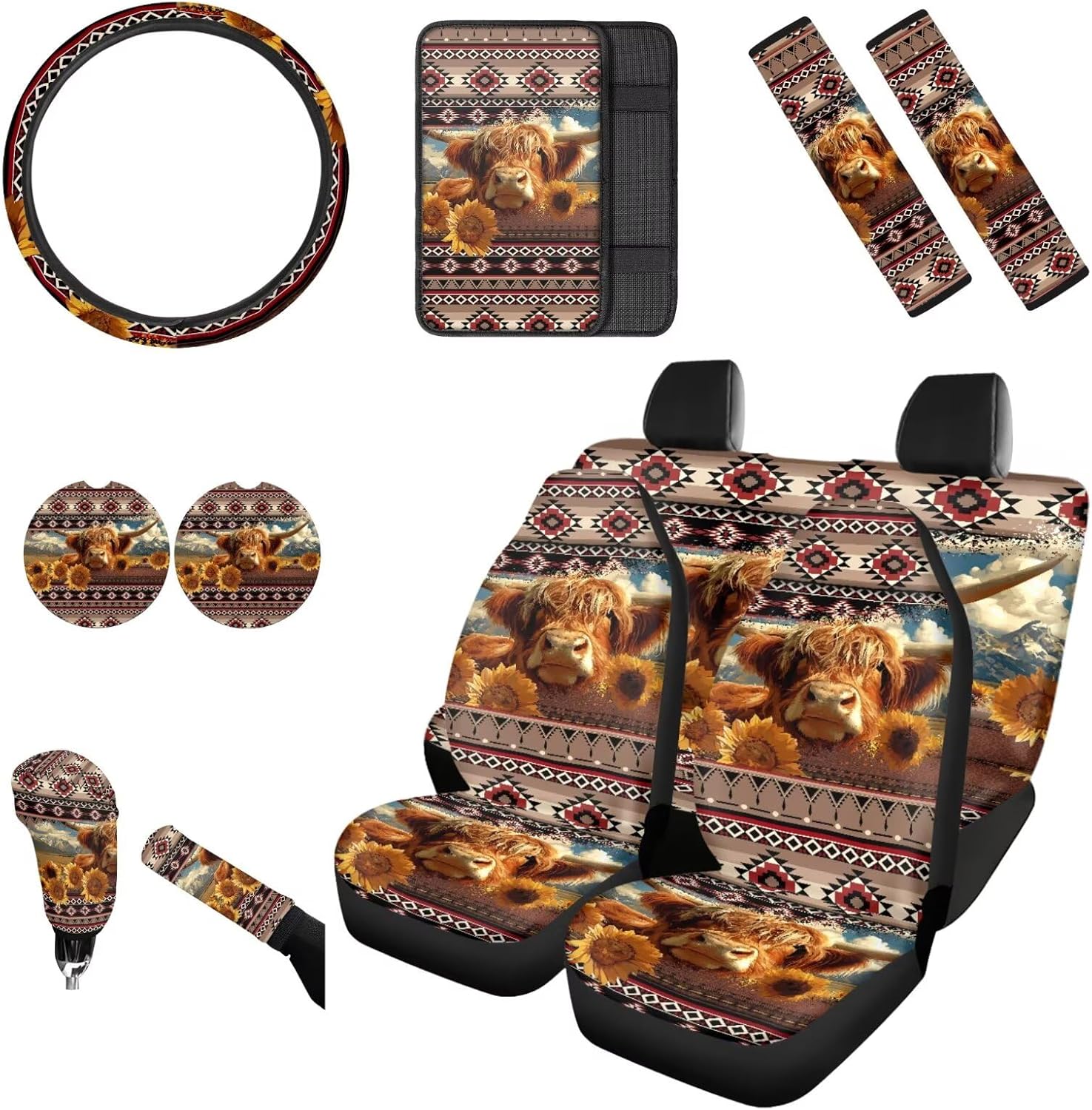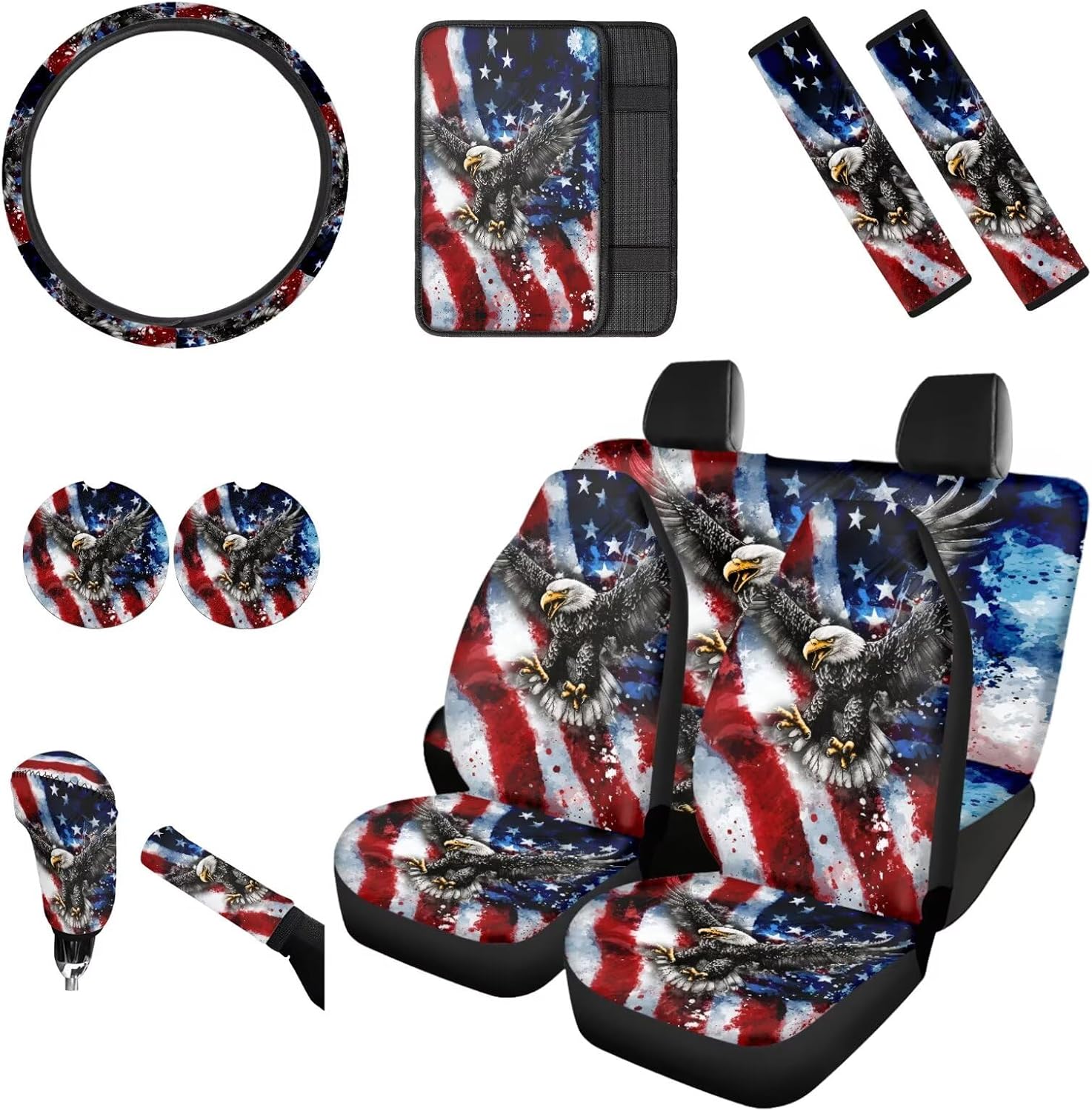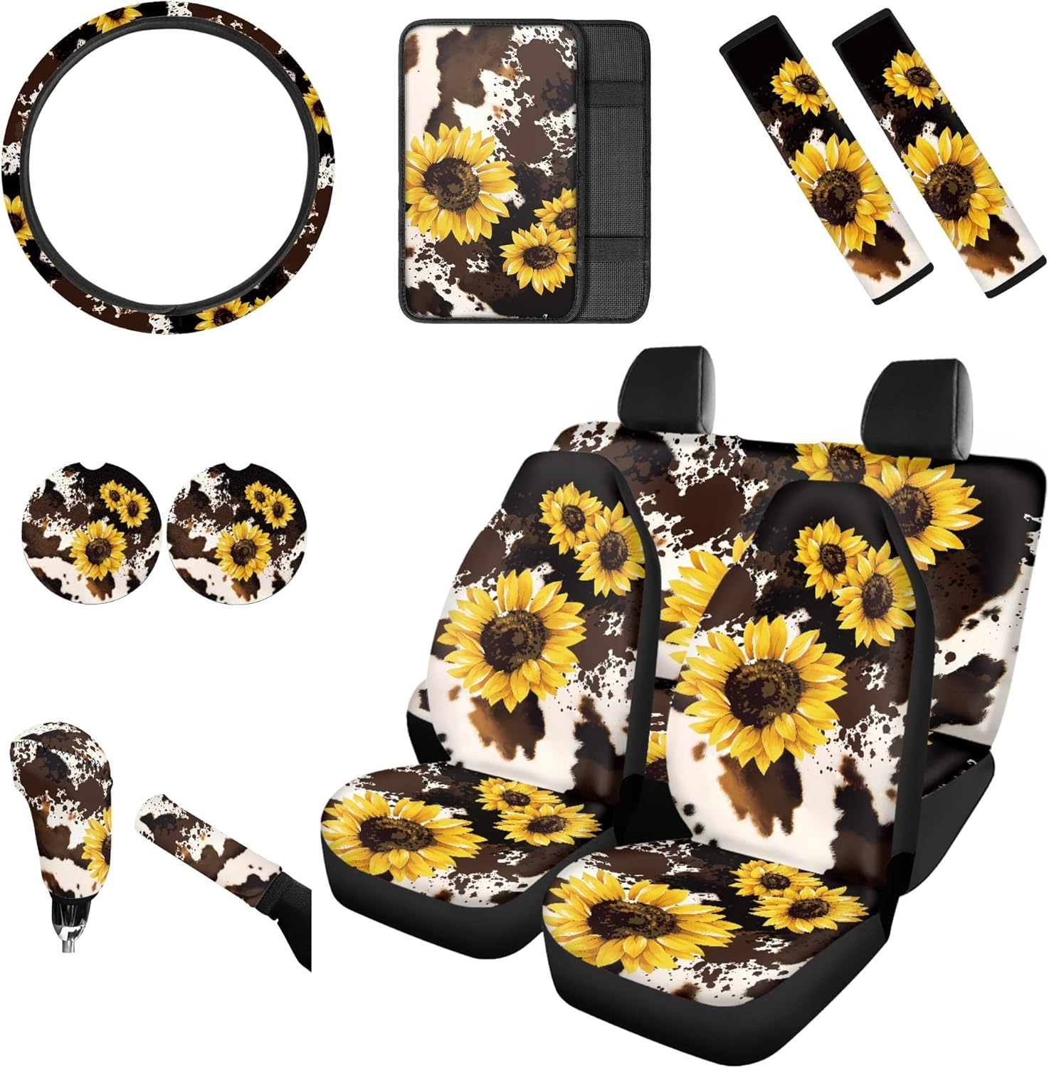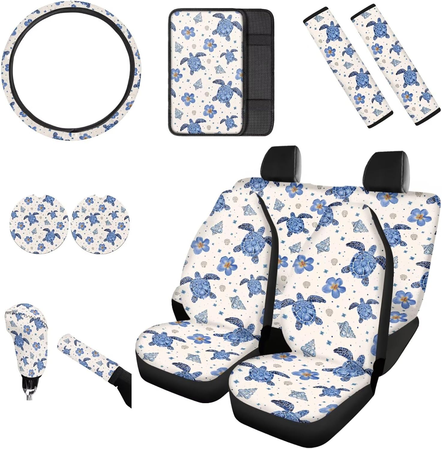 Welcome to Gearider Amazon Store Specifications: -4pcs Car Seat Covers: Made from polyester fabric, protect the interior seats from abrasions/tears/pet hair and spills -1pcs Car Steering Wheel Cover: Made from neoprene, provides moderate protection in both hot and cold weather -1pcs Car Armrest Cushion Pad: Made of polyester, equipped with 2 organizer pockets, suitable for holding your phone, keys, tissues, etc, say goodbye to clutter and keep your items within easy reach -2pcs Car Seat Belt Covers: Made of polyester and neoprene, protects your shoulders and clothing from the friction and irritation of the seat belt, keeps the neck comfortable -2pcs Car Gear Shift Knob Cover and Handbrake Grip Cover: Made of polyester, soft, stretchy, protect your car gear shift knob and handbrake lever from dust and dirt, splits, stains -2pcs Absorbent Cup Coasters: Made of Felt Surface and Galass Bottom Anti-Slip Back, which can easily absorb water from the outside of the cup, keep your car cup holder dry and clean STYLISH PATTERNS: We offer a variety of exquisite pattern designs for you to choose from, such as strawberry/ladybug/southwest aztec/highland cow/sea turtle/hippie flower/boho mandala/eagle/American Flag/butterfly/sunflower/skull/horse, etc, these special edition automotive interior accessories will add a touch of elegance and class to your vehicle EASY TO INSTALL: Elastic strap with hooks on the bottom of the seat covers, installation can be done at anywhere easily by following directions ATTENTION: Hand-wash or machine-wash with neutral detergent and cold water Dry in a well-ventilated, cool place away from direct sunlight to prevent color fading