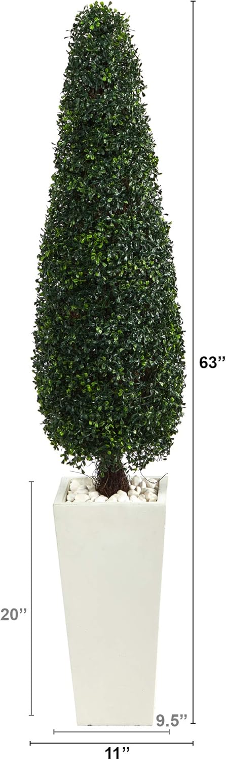 Escape to an elegant European summer villa with this perfectly trimmed Boxwood Topiary Artificial Tree – that requires zero maintenance. Always make a great first impression with a medley of lush, glossy leaves manicured in a rectangular shape. Enhance your curb appeal by placing this faux Boxwood Topiary Tree in your back yard, front yard, garden or patio and be transported to an enchanting oasis. Standing at 63", from a tall white planter (included in height), curate with other topiaries for a cohesive look. We carry boxwood topiaries in larger and smaller sizes. Silk trees are manufactured using synthetic materials, such as polyester material or plastic, and are well designed and constructed to be life-like in appearance. This item will need to be re-shaped when removed from the secure box to allow it to reach its fullest size. Your artificial plant will look beautiful for years to come; simply wipe clean with a soft dry cloth when needed.