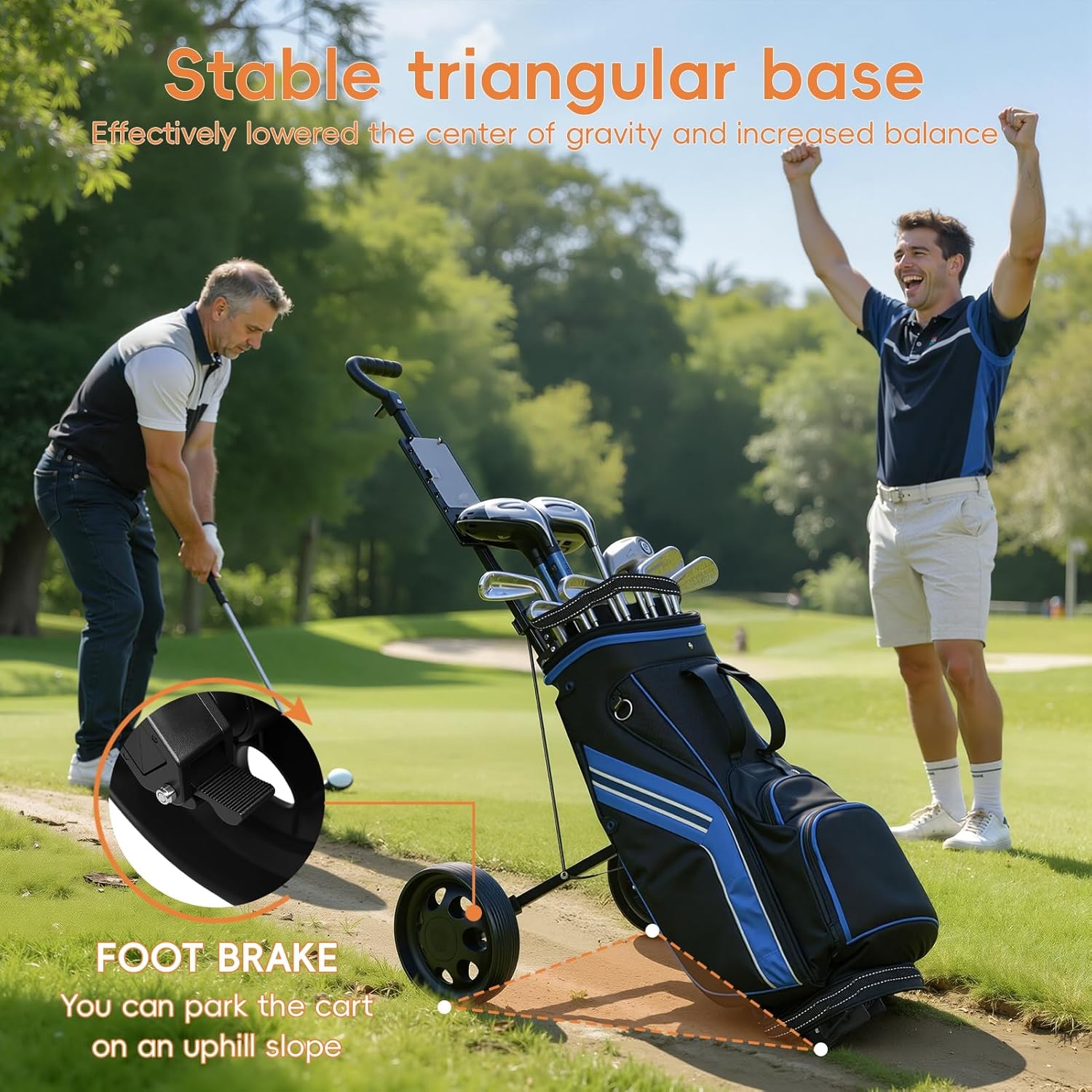 Description:Foldable and Portable Design: This golf cart features a simple foldable design that allows you to quickly and easily convert it into a compact size for convenient storage and transportation. It weighs less than 3kg, making it effortless to carry around and store in the trunk of your car.Easy to Change Direction Design: The two-wheel design combined with the lever principle enables smooth and effortless direction changes. The comfortable handle provides precise control, allowing you to maneuver the golf cart with ease on various surfaces like asphalt, concrete, and grass.Sturdy Metal Frame: Constructed with a high-quality metal frame, this golf cart boasts exceptional sturdiness and load-bearing ability. The rust-proof and waterproof spray coating on the surface ensures long-lasting durability, while the triangular base lowers the center of weight for enhanced stability.Wear-resistant PP Wheels: Equipped with two 23cm durable PP wheels covered in shock-absorbing EVA material, these wheels offer excellent load-bearing capacity and ensure stable traction on different terrains, providing a smooth riding experience.Multi-functional Storage Design: The golf cart comes with a practical storage box and golf tee holder to safely store your golf accessories. The adjustable straps securely hold any size golf bag, and the scoreboard above not only tracks scores but also provides additional storage for golf balls, tees, and a pencil.Item Name: Golf CartMaterial: IronFeatures: Wear-resistant PP Wheels, Tee Holder, Storage ScoreboardSize Details:L: 69cm/27", W: 98cm/38.5", H: 112cm/44" (Approx.) Notes:Due to the light and screen setting difference, the item's color may be slightly different from the pictures.Please allow slight dimension difference due to different manual measurement.Package Includes:1 x Golf Cart